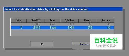 Select local destination drive by clicking on thedrive number,选择目标磁盘,选第二项然后点OK