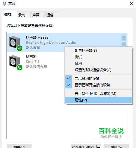 右键选择你要设置的声卡,点击“属性”。一般都是默认的播放设备,很好找