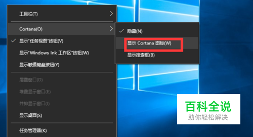 在cortana选项下选择,显示Cortana图标,如下图所示