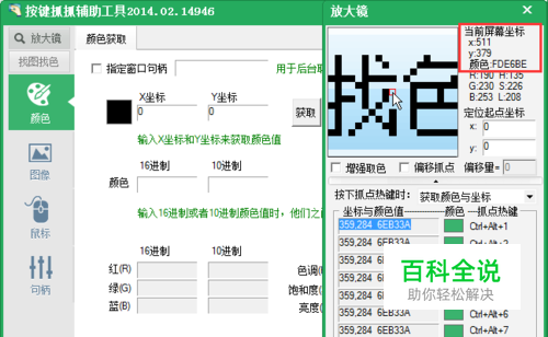首先介绍区域找色的使用。打开按键精灵的抓抓工具和放打镜,将鼠标移动到你所要获取的点,放大镜会显示出你索要获取点的信息。