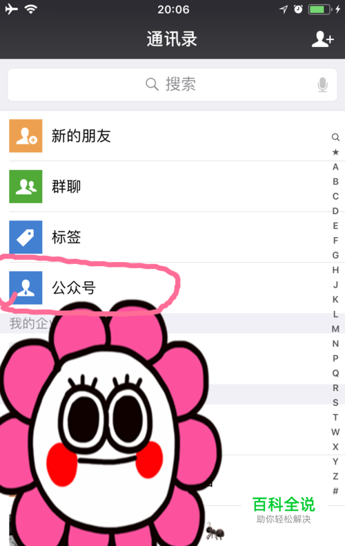 我们在“通讯录”里面,找到“公众号”界面,点击进入之后,我们点击右上角的“+”。