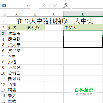 如下图格式,输入员工名单,随机数字,和中奖名单。我们假定在20里抽取3名幸运者。