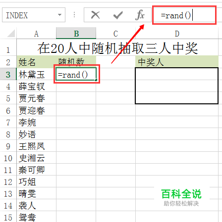 在B3单元格里输入“=RAND()”,按ENTER键,注意括号要英文状态下的。产生一个随机数字。