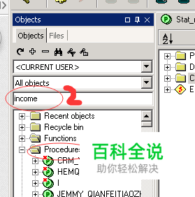 首先在PL/SQL的左侧资源栏中展开Procedures项(图中位置1),然后再其上面的搜索框中(图中位置2)输入存过名称的关键词,按回车键搜索要调试的存过,不停的回车,直到找到想要调试的存过。