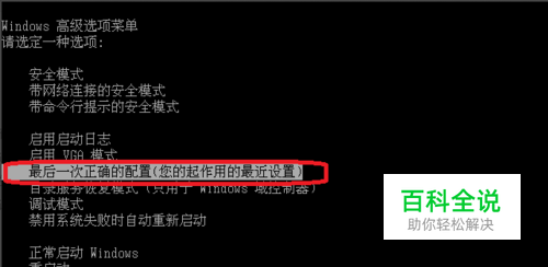首先需要重新启动计算机,在启动后按住F8,进入一个蓝色画面,如果没有进行,重新启动。进入后首先选择“最后一次正确的配置”用箭头可以进行上线选择。