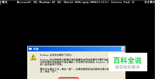 会出现以下对话框,在这个对话框中选择是进入安全模式,选择否就无法进入安全模式了,此操作一定要小心。如果不能进入安全模式则无法恢复。