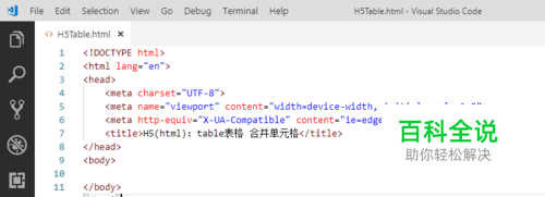 新增H5页面 1)打开VSCode编辑器,新建一个文件,保存为“H5Table.html” 2)在快速创建H5DOM结构:文件中输入一个感叹号,再按下tab键即可