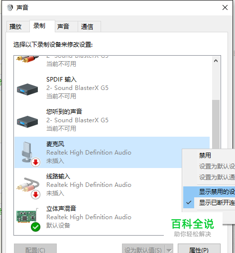 在选项里空白处右键,<显示禁用的设备>打勾