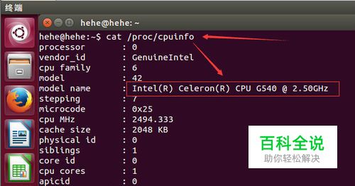 查看cpu信息,型号 我们在终端输入【cat /proc/cpuinfo】按enter执行后则显示出CPU的型号呀之类的信息啦。