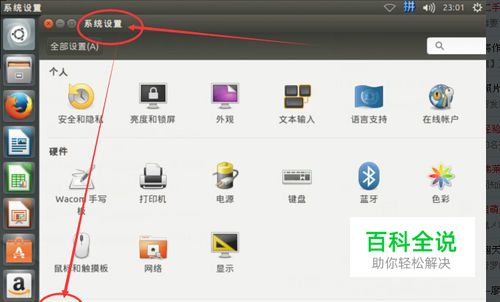 因为朋友安装的是14.10版ubuntu,所以 我先点击【系统设置】按钮,就是屏幕上左侧的那个有扳手和齿轮的那个图标。 我先点开它,看看是否能在里面找到什么。