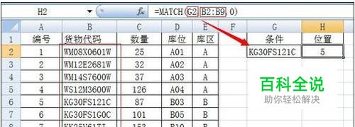 如图所示,公式为=MATCH(G2,B2:B9,0) ,G2为要查找的值,B2:B9为查找的范围,0 表示精确匹配