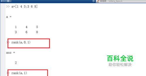 第五步我们输入rank(a,0.1)的时候,可以看到矩阵的秩为2,输入rank(a,1)的时候矩阵的秩为1,后面的参数主要用作判断精度误差,如果不考虑,直接使用rank(a)求矩阵的秩,如下图所示:
