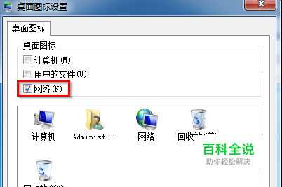 在弹出“桌面图标设置”窗口中,勾选“网络”,再点击“确定”保存即可。