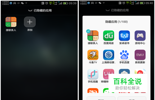 (2)桌面有隐藏图标的功能,请确认应用是否被隐藏,方法如下: 在桌面上双指外滑(即双指放大),可以进入桌面图标隐藏功能。如图所示, “搂联系人”应用被隐藏后,在桌面上就不再显示。通过点击添加按钮可以选择要隐藏的应用图标。如图所示: