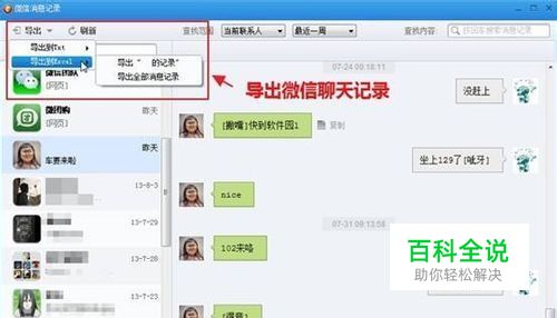 只要点击左侧联系人,就会显示与他的聊天记录,包括文字,语音、图片等。选择你要导出的语音或者文字或者图片,点击左上角的【导出】就好啦~~很简单有木有~~