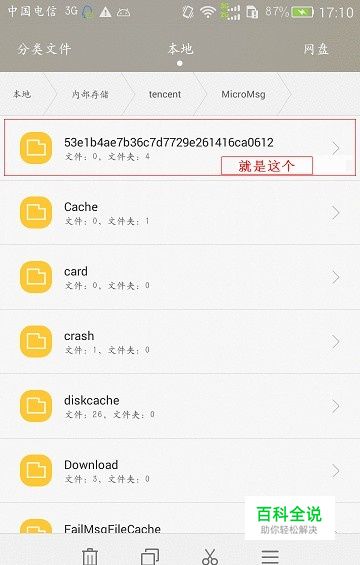 打开文件管理器,依次打开tencent/MicoMsg,在该文件夹下会有一个(或者几个)名字特别长的文件夹(如图),打开它。