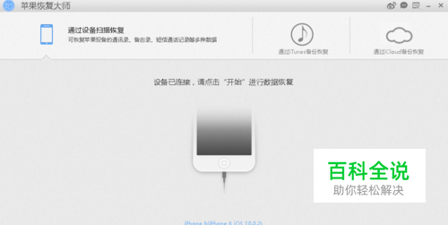 打开已经安装好的苹果恢复大师,用数据线连接电脑和手机,如果我们只想通过设备恢复点击“通过设备扫描恢复”,然后点击“开始”