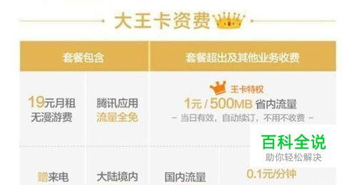 3、腾讯的小/大/天王卡 除了联合阿里、百度,联通还联合腾讯推出大/小/天王卡,早前的小王卡仅支持腾讯旗下部分产品的免流量,发展到大/天王卡,腾讯的号卡愈发成熟,先来看大/天王卡的套餐与资费状况。 其中,大王卡的月租为19元/月,包含腾讯专属流量免费、国内接听免费,超出套餐的资费为省内流量500MB/元,省外流量500MB/2元; 天王卡的月租为59元,包含腾讯专流量免费、500分钟国内语音、国内接听免费,超出套餐资费情况为省内流量500MB/元,省外流量500MB/2元。 此外,腾讯大王卡,每天1元,1元500MB的资费,着实是业界良心。