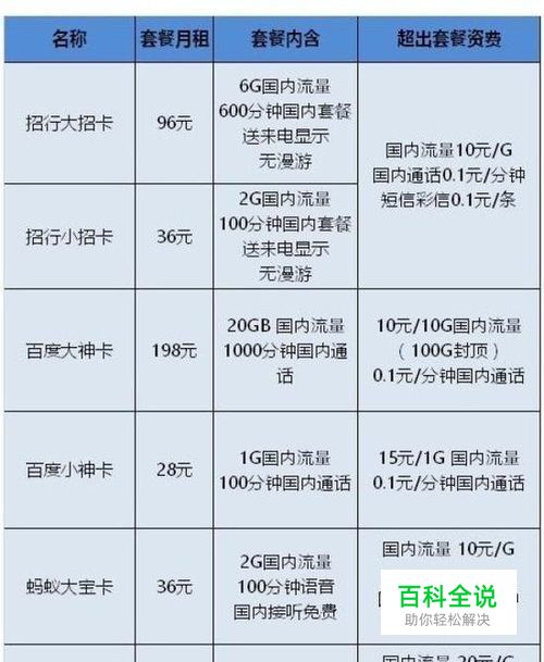 4、招行大/小招卡 在推出腾讯王卡、蚂蚁宝卡之后,联通携手招商银行推出了大小招卡。其中,招行大招卡的套餐月租为96元,包含6G国内流量、600分钟国内套餐、无漫游,超出套餐资费为国内流量10元/G、国内通话0.1元/分钟;招行小招卡的套餐月租为36元,包含2G国内流量、100分钟国内套餐、无漫游,超出套餐资费为国内流量10元/G、国内通话0.1元/分钟。 从资费情况来看,招行的小招卡对于流量少、语音通话少的用户而言,是百利而无一害。