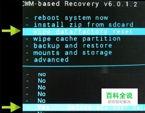 进入recovery界面之后先进行双清,(按音量键表示选择,按HOME键表示确认),依次执行 wipe data/factory reset——Yes——delete all user datawipe cache partition——Yes-Wipe Cache