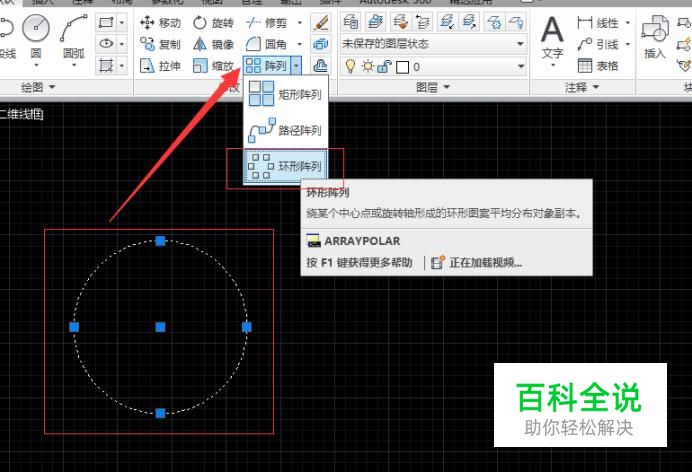 选中圆,点击菜单栏中的阵列选项,再选择“环形阵列”。