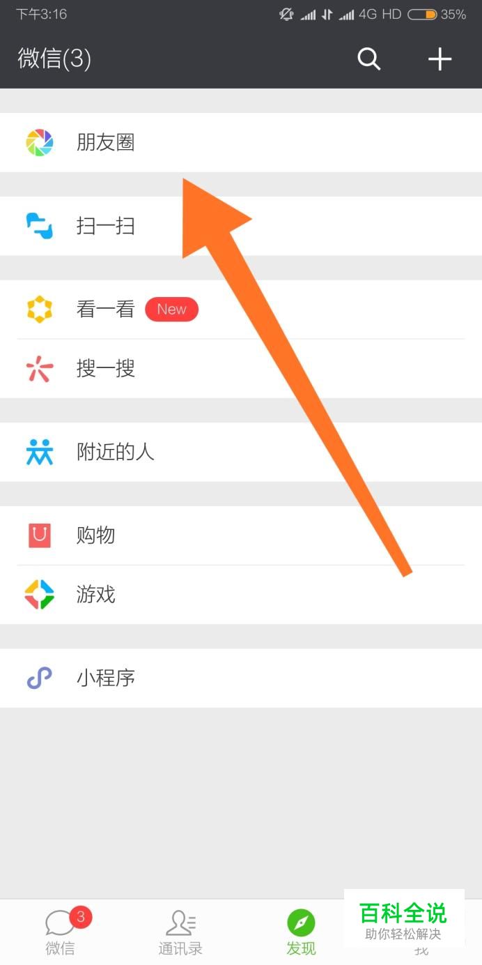 首先进入微信“发现”页面,点击进入“朋友圈”。