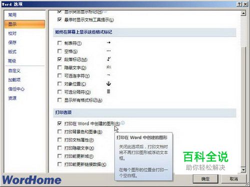第2步,在打开的“Word选项”对话框中,切换到“显示”选项卡。在“打印选项”区域列出了可选的打印选项,选中每一项的作用介绍如下: (1)选中“打印在Word中创建的图形”选项,可以打印使用Word绘图工具创建的图形; (2)选中“打印背景色和图像”选项,可以打印为Word文档设置的背景颜色和在Word文档中插入的图片; (3)选中“打印文档属性”选项,可以打印Word文档内容和文档属性内容(例如文档创建日期、最后修改日期等内容); (4)选中“打印隐藏文字”选项,可以打印Word文档中设置为隐藏属性的文字; (5)选中“打印前更新域”选项,在打印Word文档以前首先更新Word文档中的域; (6)选中“打印前更新链接数据”选项,在打印Word文档以前首先更新Word文档中的链接,