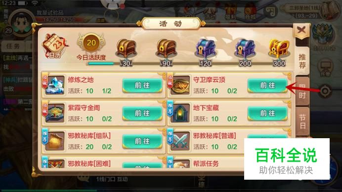 进入活动界面,在列表中点击“守卫摩云顶”前往,每日能够参加2次,完成后获得10点活跃度。