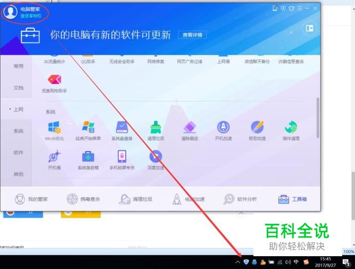 再次点击下拉列表,可以在弹出的窗口中选择盾牌图标进入电脑管家。