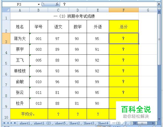 首先,我们需要计算出每个人的总分。 在F3中输入公式”=sum(C3:E3)“。 说明SUM是求和函数,表达式为:SUM(number1,number2,number3,........)