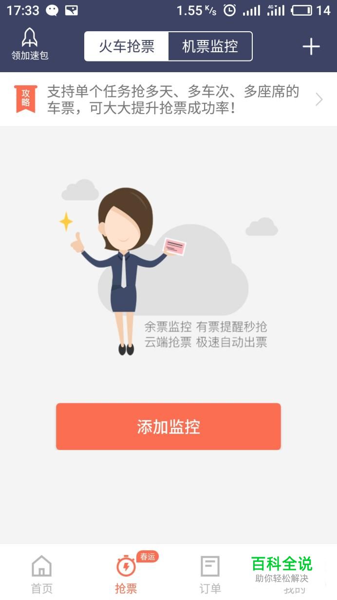 点击抢票按钮进入该界面,进入之后选择火车票或机票,然后点击添加监控。