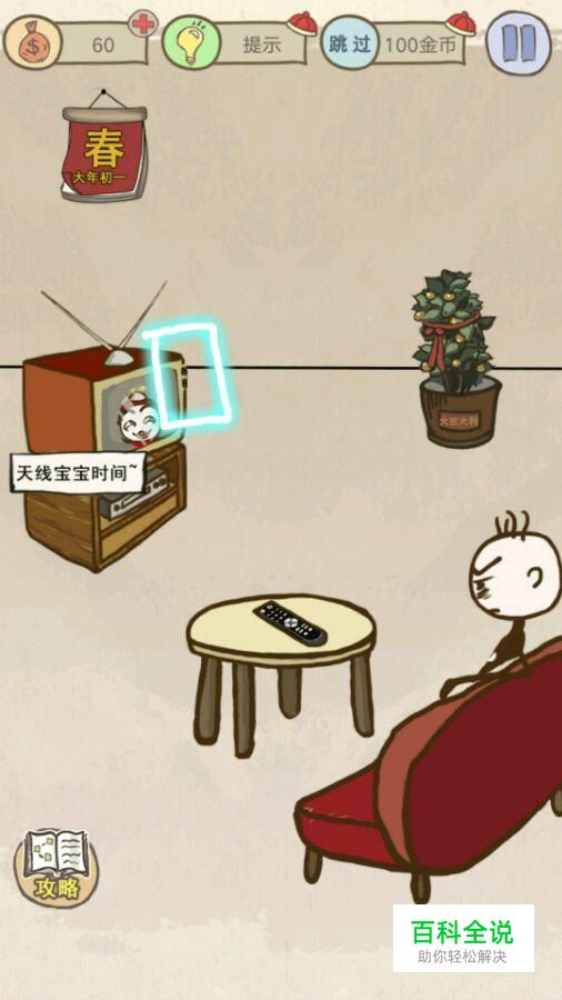 第一关:看春晚。 点击电视旁边的按钮,把电视关掉就行了。