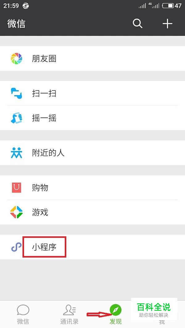 首先进入微信的主界面,点击“发现”的页面后,就可以看到“小程序”的功能了,点击进入小程序的功能页面。