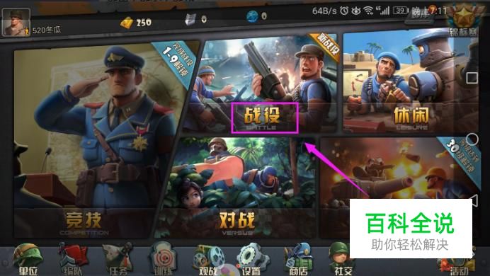 接着我们就来到了游戏界面,我们在这里点击战役,进行解锁第七关,如图所示。