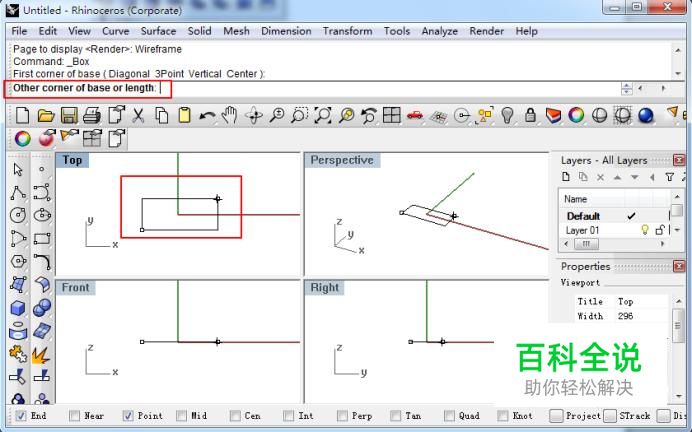 根据指令框中提示“Other corner of base or length”,在Top视图窗口中指定基面另一个角点位置,点击左键确定,基面长方形就建好了。