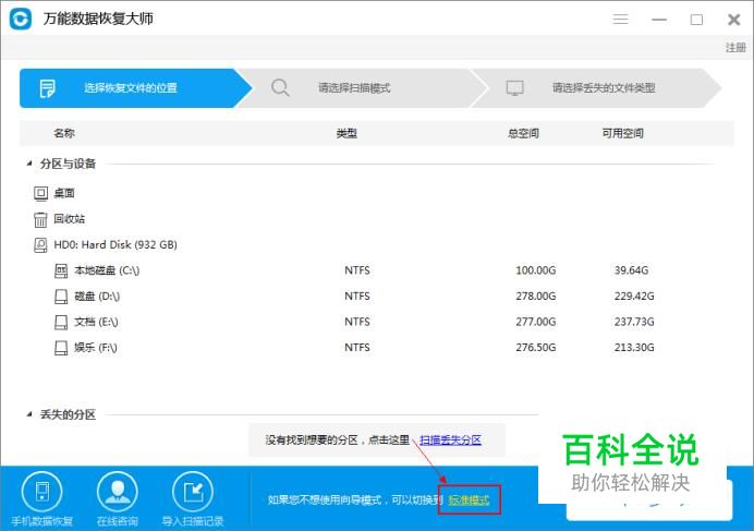 点击下方的标准模式,在界面上可以看到有六个功能模式,选择要恢复的模式。小编选的是“深度恢复”。