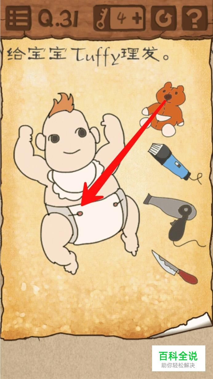 第三十一关:给宝宝理发啦,让宝宝睡着,我们就可以安心理发了,怎么让宝宝睡着呢?将玩具熊移到宝宝怀着,然后宝宝就会睡着,接着点击剃头发的工具,就可以给宝宝理好发啦!