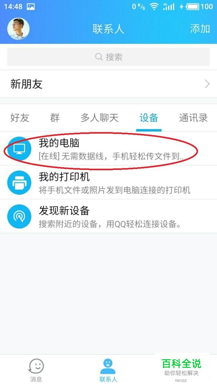 进入联系人后,找到“设备”-“我的电脑”,并点击进入。