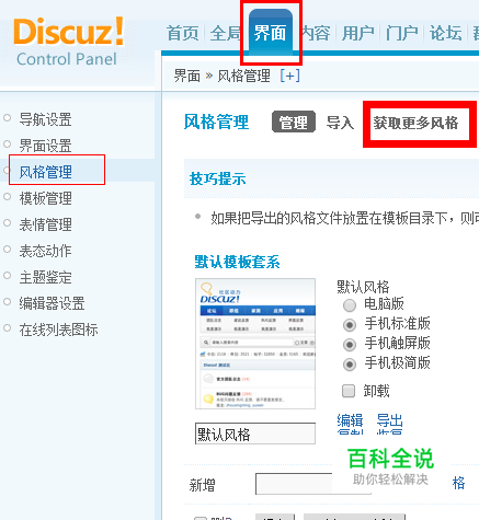 dz论坛模板安装方法,打开dz后台找到界面,然后找到风格管理。