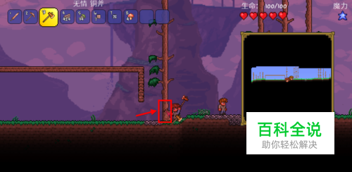 砍树。泰拉瑞亚游戏前期对木材的需求是非常大的。 砍树的正确方法是瞄准大树底部用斧子砍,一棵树能获得不少木材。