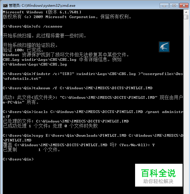 修复 3.1 授予管理员恢复对以前被拒绝的文件的访问权限 takeown /f C:\Windows\IME\IMESC5\DICTS\PINTLGT.IMD 3.2 提供了ntfs权限的备份与恢复 icacls C:\Windows\IME\IMESC5\DICTS\PINTLGT.IMD /grant administrators:F 3.3 还原 copy E:\Users\Qin\Downloads\PINTLGT.IMD C:\Windows\IME\IMESC5\DICTS\PINTLGT.IMD 注:E:\Users\Qin\Downloads\PINTLGT.IMD 是第二步找到的正确文件