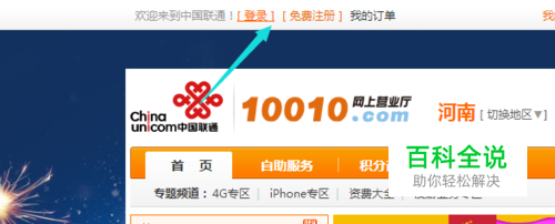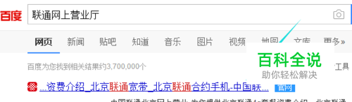 打开浏览器输入“联通网上营业厅”,然后点击如图中的搜索结果进入营业厅首页。