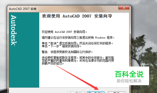 进入cad安装向导页面→点击下一步→进入软件许可协议点击“我同意”→下一步。