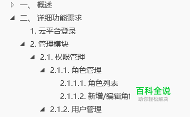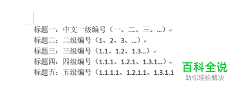 在word文档中,我们想要设置五级标题,效果如图所示。 其中一级标题的编号为中文的,二三四五级标题的编号为数字,且不显示一级标题的中文编号。