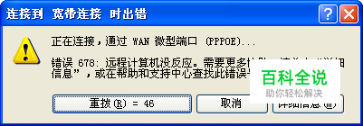 对于很多朋友会碰到这样一个情况,电脑不断的弹出窗口提示说:连接到宽带连接时出错,正在连接,通过WAN微型端口(PPPOE),错误 678 远程计算机没反应;正在进行第1次试拨,无法建立连接;需要更多协助,请单击“详细信息”,或在帮助和支持中心查找此错误号等问题。