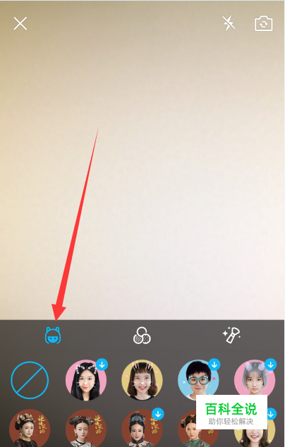 拍摄页面下方的第一个按钮可以更改头部装饰,比如更换发型、更改图片背景、更改表情动作等等。如下如所示: