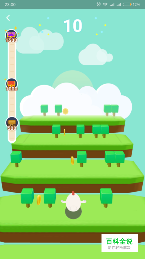 可以看到游戏是一个个台阶一样的,小鸡是通过蹦跳来攀爬,中间不能撞到小树上,如果一旦撞到树上,游戏就结束了哦。