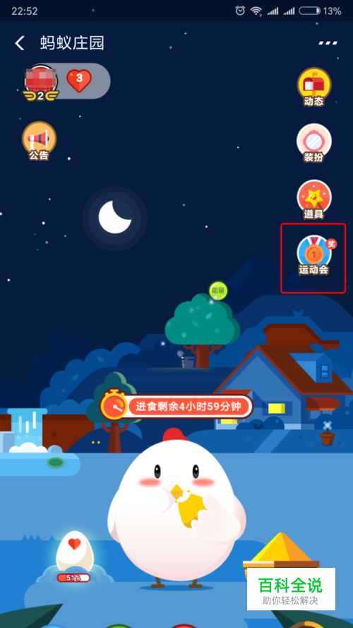 打开支付宝后进入到蚂蚁庄园游戏中,在右侧的菜单栏中点击【运动会】