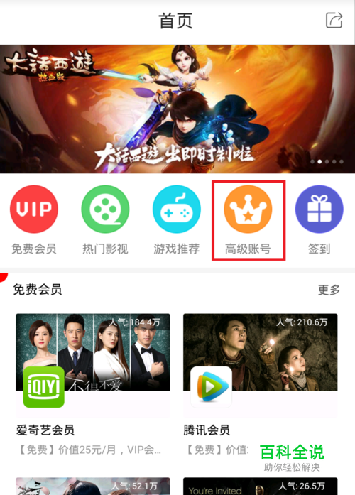 进入马上玩App,在首页点击“高级账号”栏目