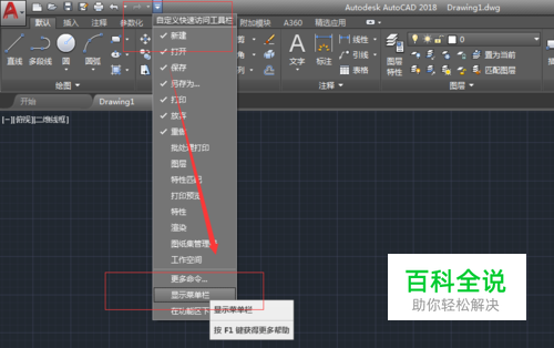 打开AutoCAD2018,找到左上角的向下三角形,打开,点击显示菜单栏